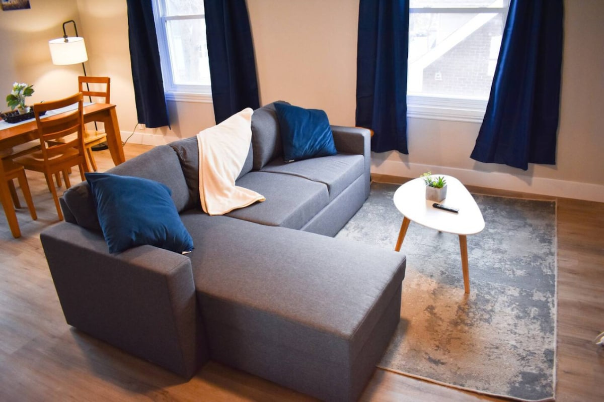 Apartamento executivo de um quarto lindamente decorado, com tema azul. Ideal para viagens a trabalho ou escapadas românticas. Convenientemente localizado no coração de Walkersville, a unidade iluminada tem uma cama tamanho queen, uma bela cozinha e banheiro, uma espaçosa sala de jantar, uma sala de estar deslumbrante e um pequeno escritório. Estamos localizados a apenas 15 minutos do centro de Detroit através do túnel, a 15 minutos do aeroporto de Windsor e a 5 minutos da estação de trem Via.
