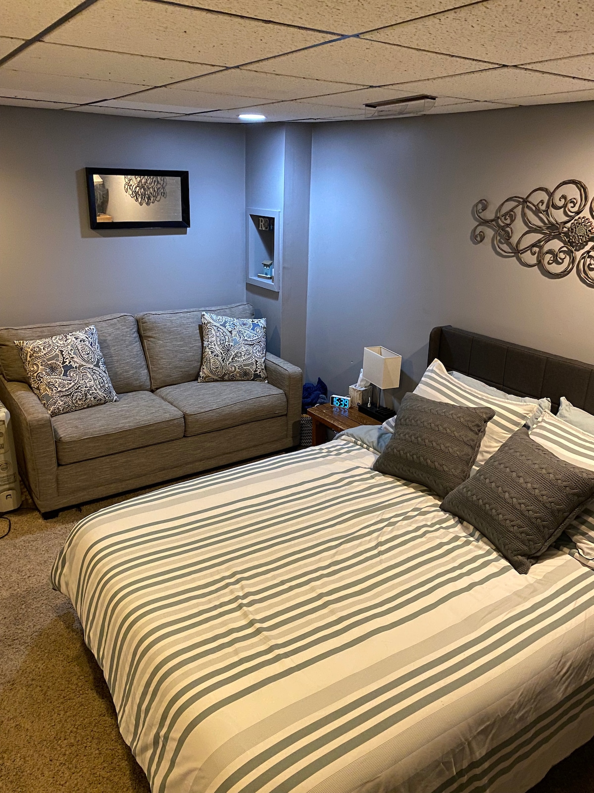 Entre em um espaço privado e aconchegante. Relaxe assistindo TV na cama ou no sofá. Este lugar faz parte do nosso porão, então você pode ouvir o dia a dia vivendo no andar de cima. Para sua segurança, há uma câmera Ring instalada na entrada e iluminará a entrada quando estiver escuro. O estacionamento é na rua pública bem iluminada. Caminhe facilmente pela nossa calçada dedicada do Airbnb, sem degraus, caminhe até os fundos da casa. Você estará em um espaço sereno que faz você se sentir em casa.