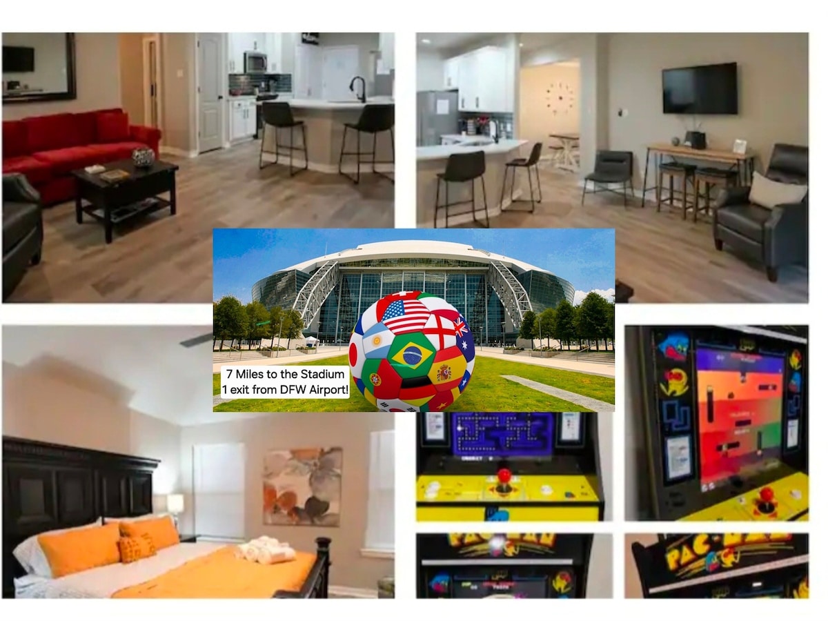 The Signature Inn is the perfect location between Dallas and Ft. Worth. We are 5 miles from DFW Int'l Airport and 7 miles from AT&T Stadium & Globe Life. We are a short drive from the American Airlines Ctr, Texas Motor Speedway, Stockyards, and multiple golf courses This home features 2 king size beds, one being a sleep #, 1 queen size bed, and a cozy bedroom perfect for kids with a bunk, full, and twin size bed. Pac Man, Ping Pong, game table, board games, jumbo connect four and corn hole!