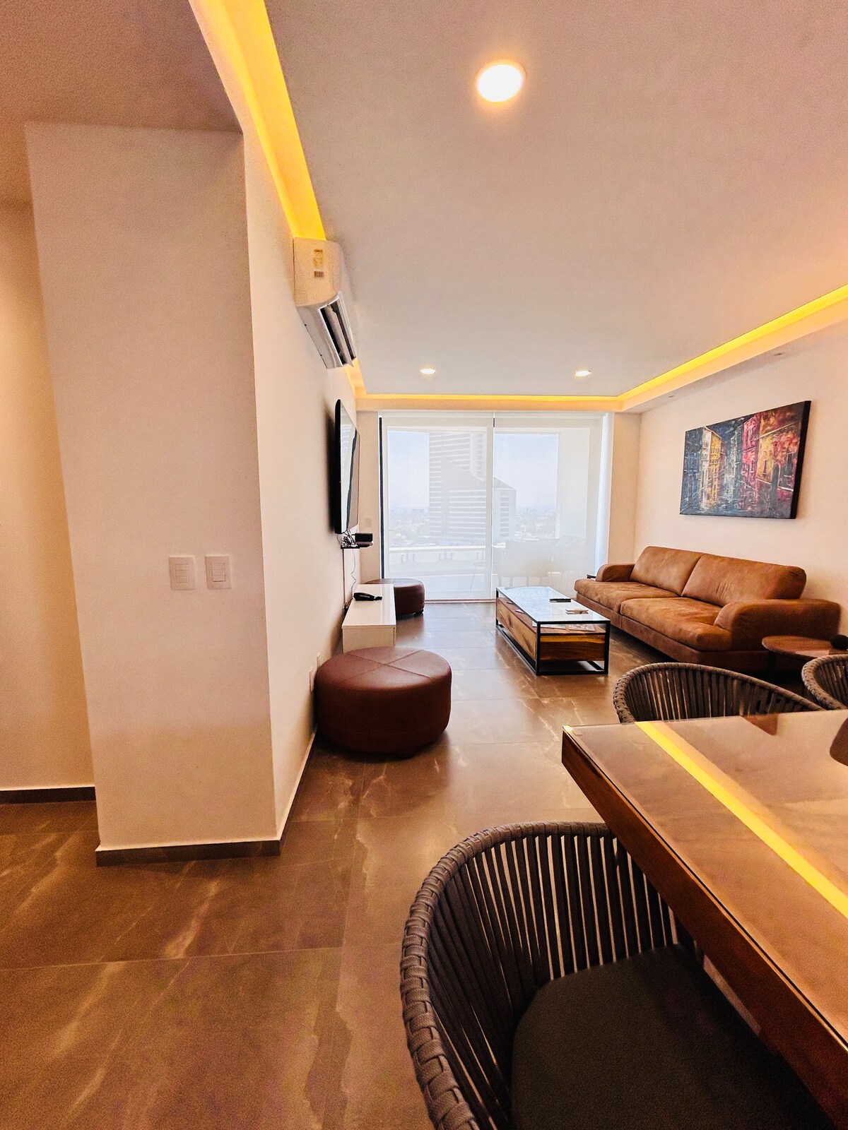Apartamento luxuoso e bonito com design e móveis em art déco, relaxe e aproveite a vista porque fica no 9º andar, tem comodidades como piscina panorâmica, academia, telhado panorâmico, sala social, churrasqueiras, segurança e elevadores. O apartamento tem um quarto com uma cama queen size, um banheiro completo, lavanderia, cozinha completa, geladeira com máquina de gelo e dispensador de água fria. Nós fornecemos 2 toalhas para chuveiro e 2 toalhas para a piscina. Nós também oferecemos passeios para a cidade e cidades mágicas.