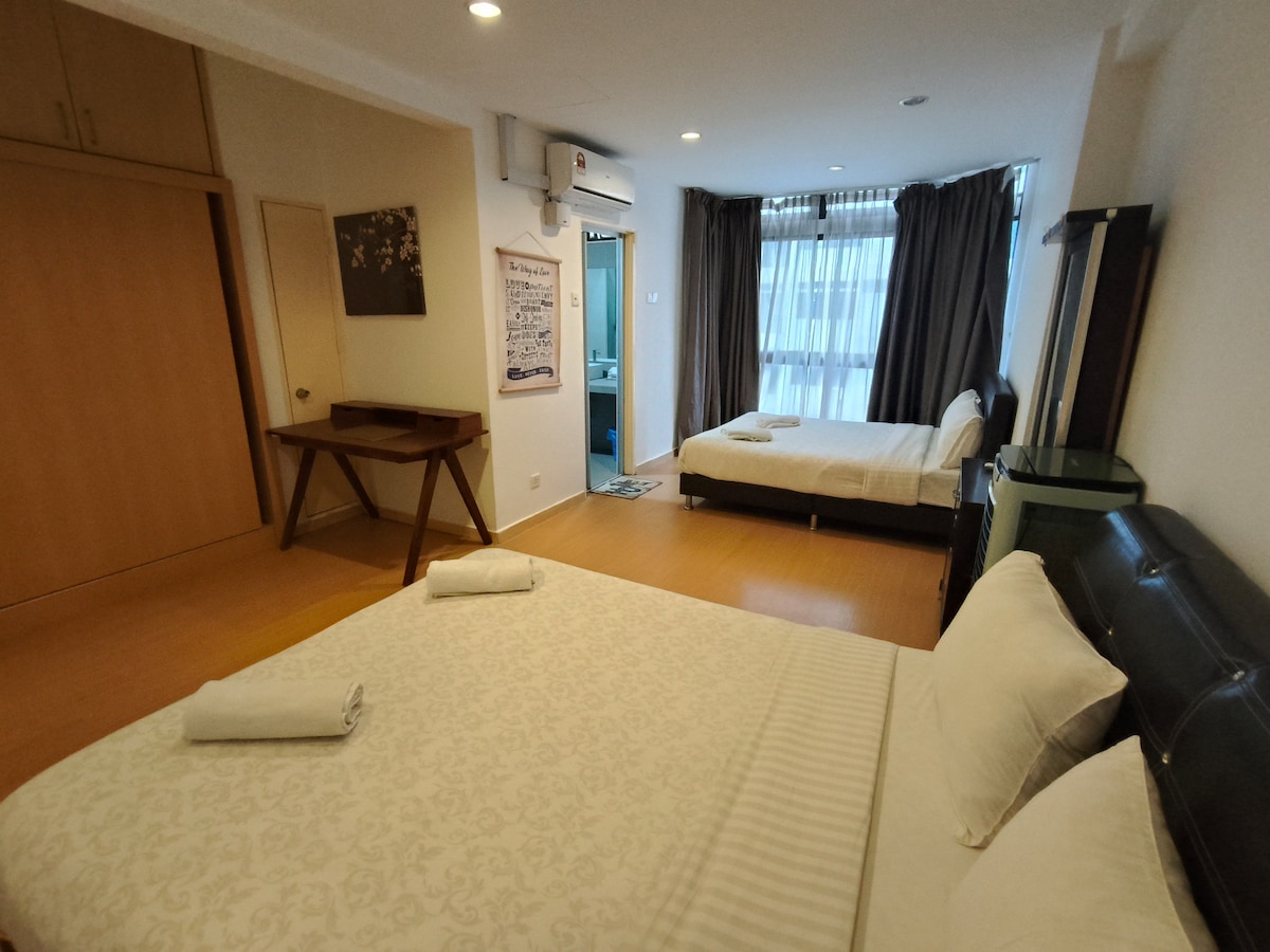 Apartamento moderno de 3 quartos recém-reformado de 1800 pés quadrados no coração do distrito comercial de KL. Diretamente em frente ao Pavilion Mall. Bom custo-benefício e perfeito para a família com orçamento. Quarto principal: 1 cama tamanho king, 1 sofá-cama tamanho queen (opcional) com banheiro privativo anexo 2º BR: 1 cama King, 1 cama de solteiro (opcional) com banheiro privativo anexo 3º BR: 1 Queen O 3º banheiro é um banheiro comum. Os hóspedes terão acesso ao KLCC, B.Bintang, Jalan Alor, tudo a 10 minutos a pé. Estacionamento gratuito disponível.