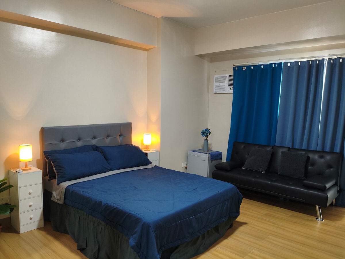 Fully furnished unit with divider for bedroom. Walking distance to groceries, convenience stores, restaurants, malls, banks, bars. Active night life! ❤ Pool, Sauna & Gym Access (w/ fee) ❤ 55" 4k UHD TV + A/C + Workspace ❤ Streaming apps available using your own account ❤ Coffee, fresh towels, and essentials provided ❤ Filtered & Alkaline Drinking Water ❤ Child & Dog-friendly ヅ Accessible paid parking off premises ヅ Reliable WiFi perfect for remote work