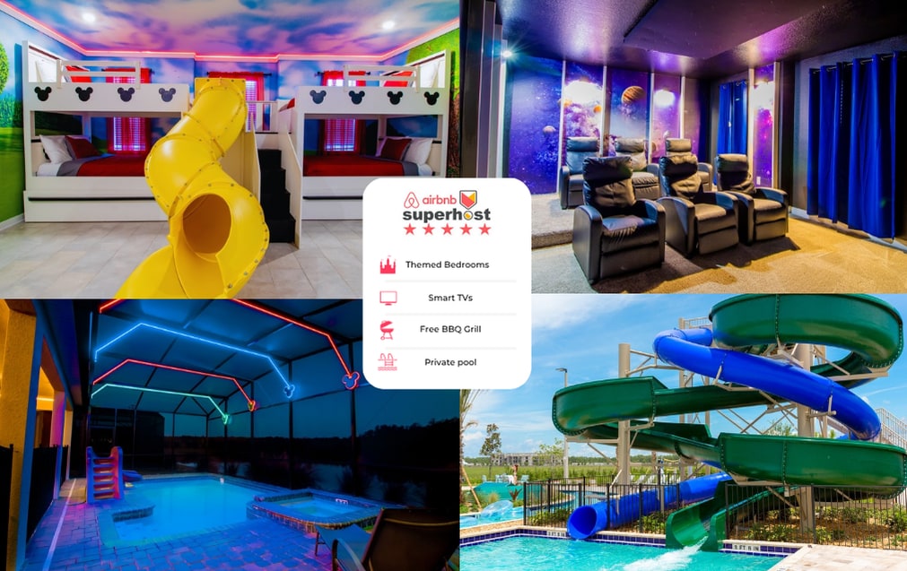 Discover magic in our charming villa at Fantasy World Villas, near Disney, Universal & Sea World. Enjoy a whimsical Mickey & Minnie-themed room, king-size master bedroom, modern kitchen, and private patio. Resort: pools, slides, lazy river, kids' activities, gym, sports courts & more. Walk to shops & restaurants. Free WiFi, parking & resort access. Create unforgettable memories in our enchanting villa, just steps from theme parks & resort fun! Book now!