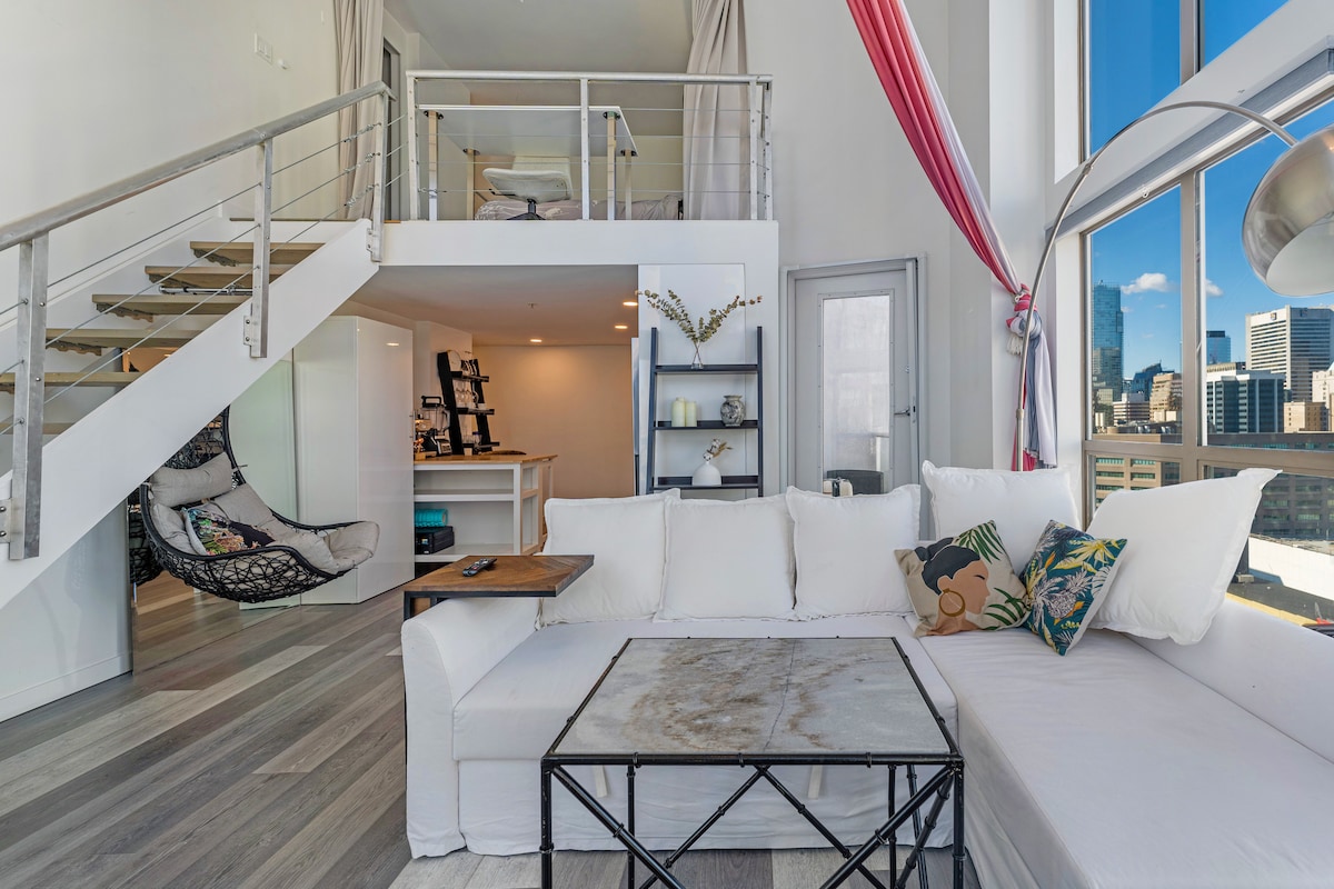 Loft boêmio brilhante – 2 camas | AC | Estacionamento gratuito
