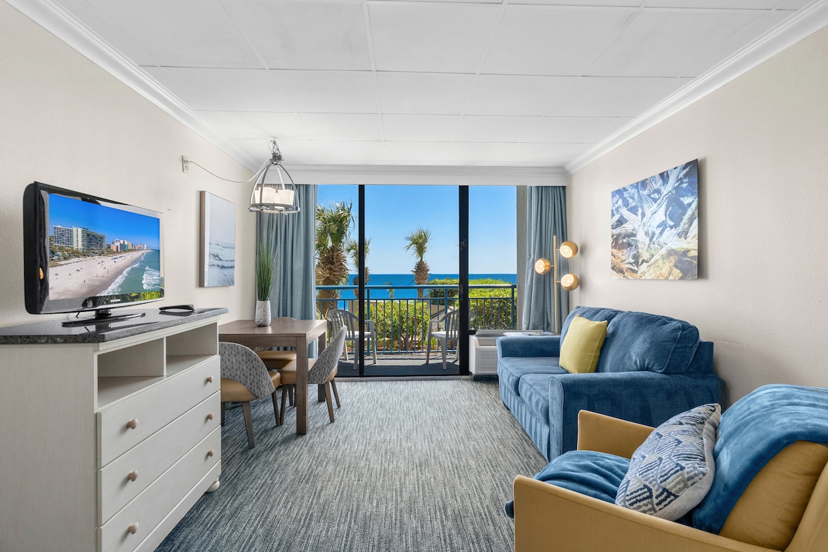 Suíte de 1 quarto à beira-mar • Melhores vistas do edifício • Aceita animais de estimação! Acorde com vistas deslumbrantes para o mar nesta suíte de 1BR/1BA no Patricia Grand Resort, o melhor avaliado! Espaçoso, moderno e adequado para animais de estimação, com uma área de banheiro para cães convenientemente ao lado. Relaxe na sua varanda privativa, cozinhe na cozinha completa ou relaxe na acolhedora área de estar — tudo a poucos passos do Myrtle Beach Boardwalk e das atrações locais. Desfrute das melhores vistas do edifício para uma estadia verdadeiramente inesquecível!