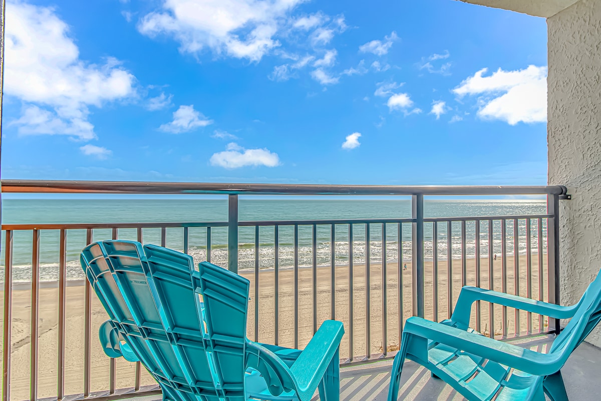 RECÉM-ATUALIZADA em novembro de 2025, esta INCRÍVEL unidade tem piso de madeira, lareira e novos móveis e colchões. Vista deslumbrante DIRETAMENTE À BEIRA-MAR da bela costa do oceano Atlântico através de janelas do chão ao teto e 2 varandas privativas. Localizado NO CORAÇÃO DE MYRTLE BEACH, bem ao lado do calçadão, CAMINHE ATÉ TODAS AS ATRAÇÕES, lojas e restaurantes! A apenas um quarteirão de distância, você pode desfrutar do parque aquático e de diversões Family Kingdom, a poucos passos do 2nd Ave Pier e do centro da cidade, a Skywheel fica a menos de 1,6 km de distância.