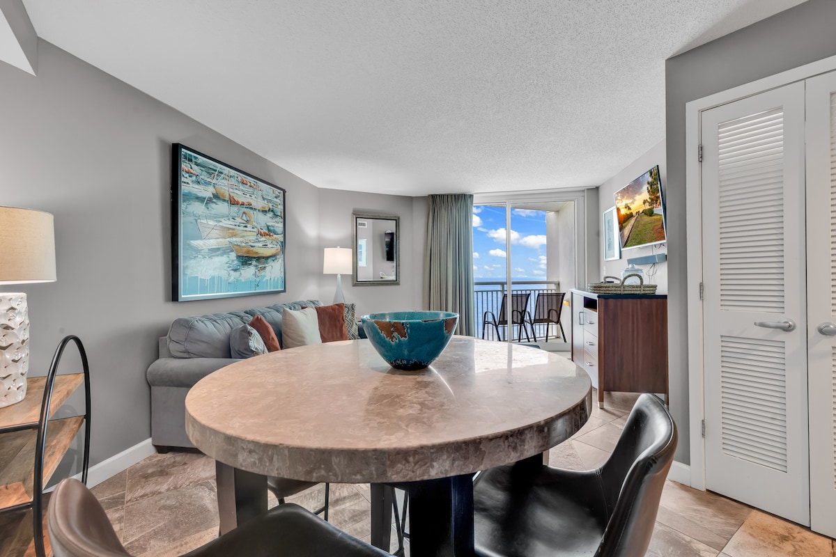 Acorde com vistas deslumbrantes do Atlântico e do interior e do pôr do sol a partir da sua varanda privativa. Totalmente renovado com decoração costeira moderna, Smart TV e camas confortáveis. Passos para a praia, calçadão e SkyWheel. Desfrute de rios preguiçosos, piscinas, banheiras de hidromassagem, bar tiki e Starbucks no local. Escapada romântica perfeita ou para famílias pequenas no coração de Myrtle Beach! Estacionamento e Wi-Fi grátis. Reserve já!