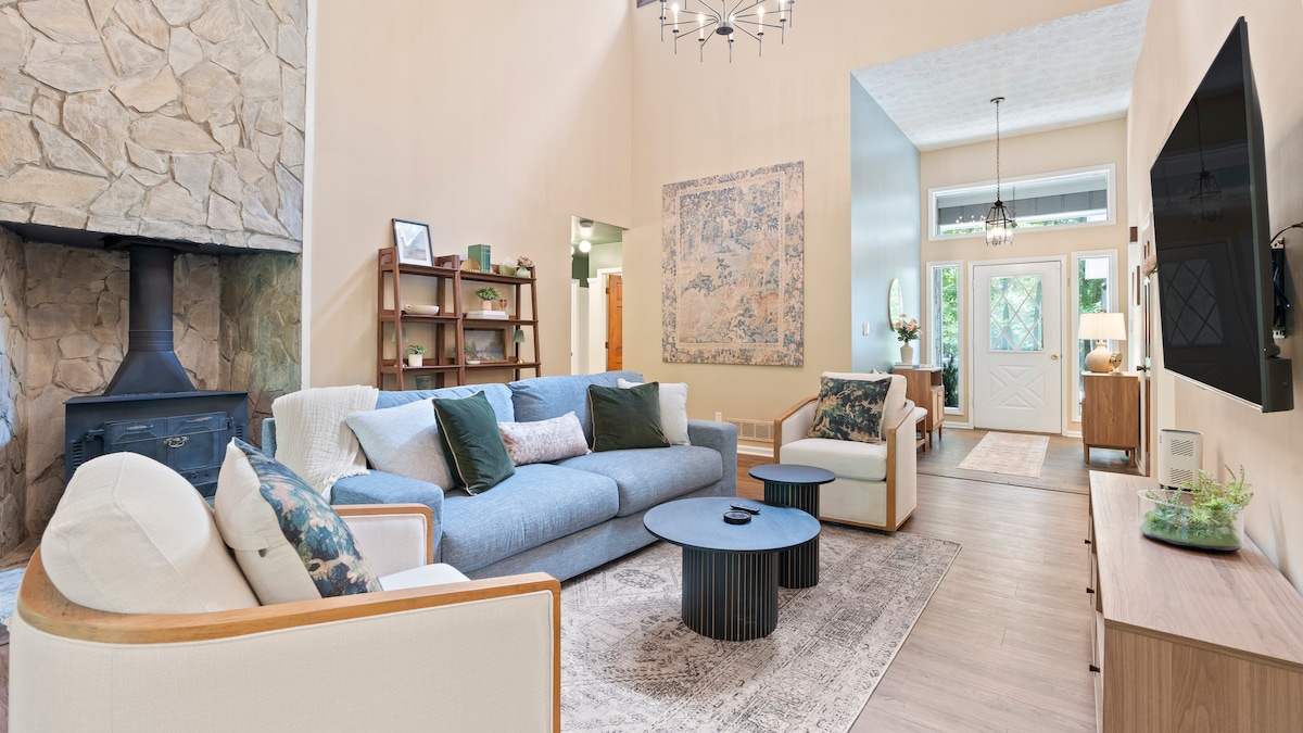 A localização privilegiada desta propriedade no Lago Peachtree oferece uma variedade de comodidades, como áreas de piquenique, um playground para as crianças, trilhas de caminhada/corrida em frente ao lago, trilhas de carrinho de golfe ao redor do lago, oportunidades de pesca da costa do quintal. Além disso, os hóspedes podem nadar no lago ou usar pranchas de remo, canoas, caiaques e barcos a remo. Esta casa única tem um chuveiro ao ar livre. A pitoresca vista para o lago oferece um cenário ideal para praticar ioga ou desfrutar de um pôr do sol tranquilo.