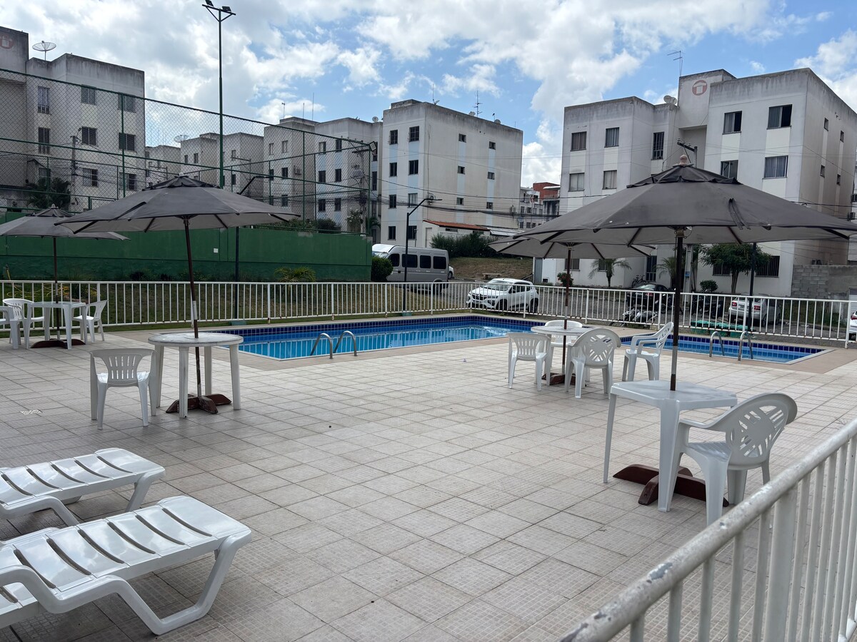 🏠 Conforto e Segurança a 10min do Centro! 📍 Desfrute de um apê térreo inteiro e seguro (condomínio privado com portaria 24h) com vaga para estacionar, mini-mercado 24h e lavanderia no local. Prepare suas refeições na cozinha equipada (panelas, assadeiras, cafeteira italiana, sanduicheira, mixer, copos, xícaras e talheres), durma em uma confortável cama de casal com roupa de cama pronta para você e navegue com Wi-Fi de qualidade. Esperamos por você! *Não fornecemos toalhas e sabonetes.