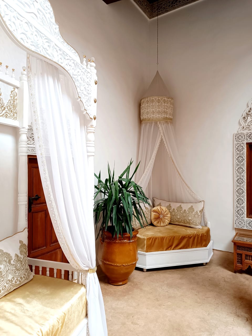 Esta bela suíte no RIAD DAR ARSAMA lembra o palácio das 1001 Noites de Sherezade. Luxo e conforto misturados com um design tradicional e iluminação única que dá uma atmosfera romântica. É ideal para casais, famílias ou grupos de amigos com 2 camas de casal. Excelente localização, café da manhã incluso. Violeta e Adil cuidarão de você e ajudarão em tudo o que você precisar. Fique conosco!