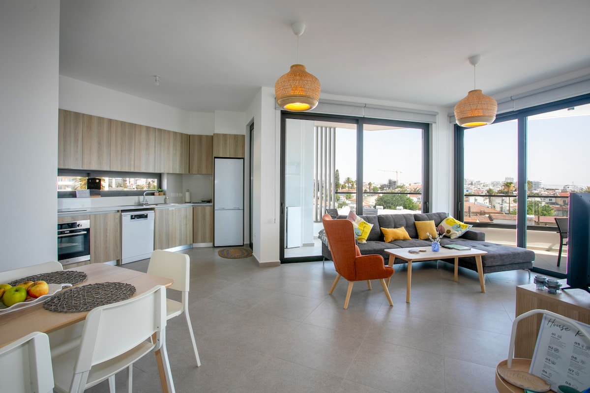 Acorde com vistas panorâmicas para o mar e para a cidade a partir do seu terraço privado com rede - apenas a 3 minutos a pé da Praia de Finikoudes. Desfrute de um apartamento moderno com cozinha completa e área de estar espaçosa. Relaxe no seu terraço com o mar cintilando durante o dia e os céus brilhando ao pôr do sol. Durma confortavelmente nos quartos com ar-condicionado e trabalhe eficientemente no espaço de trabalho dedicado com monitor e Wi-Fi rápido. A poucos passos do calçadão, restaurantes, cafés, lojas, marina, vida noturna e estacionamento coberto seguro incluído.