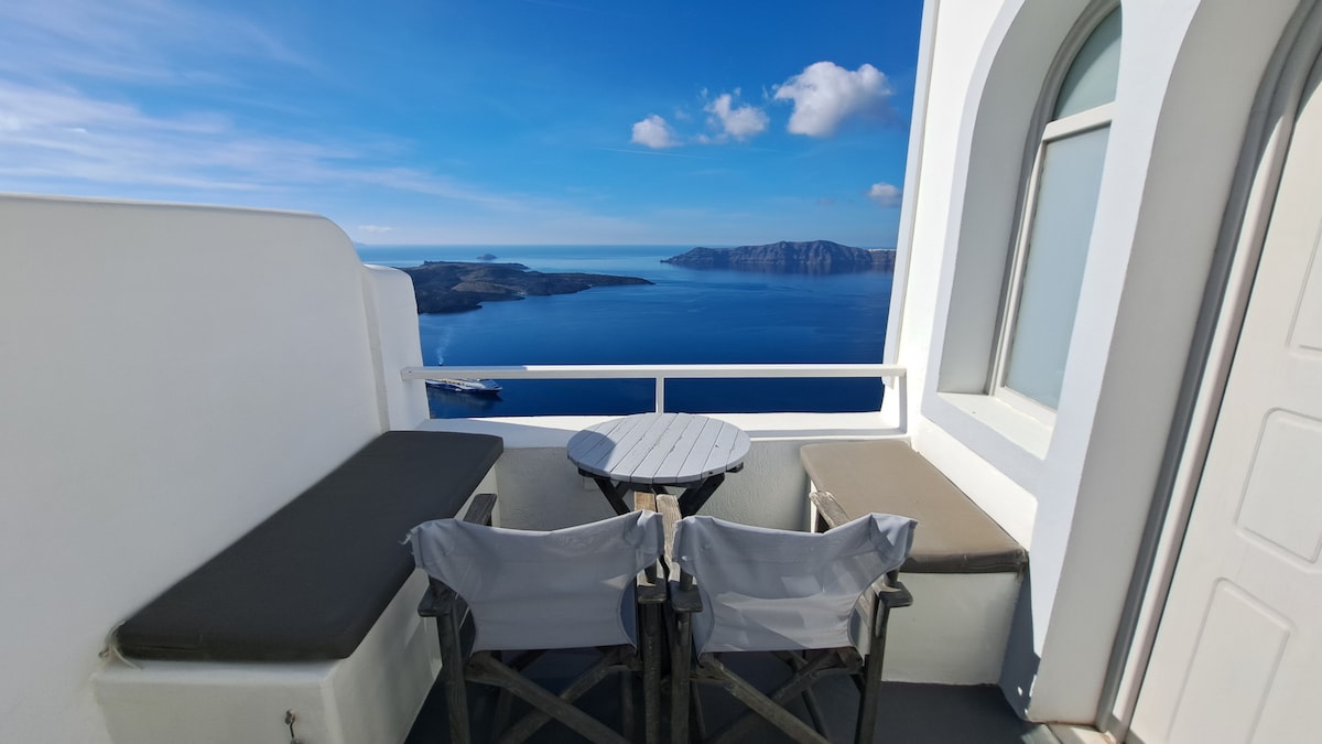 Bem-vindo à Casa dos Músicos! Cor, vistas, cozinha totalmente equipada, dois quartos, arquitetura cicládica e moderna combinada, muitas varandas ao redor para desfrutar de belas vistas e relaxar, localizado entre as aldeias Firostefani e Imerovigli, a poucos minutos das vistas deslumbrantes da Caldeira!Nós moramos nesta casa no inverno tocando muita música e nós a projetamos com enorme quantidade de amor. Se você quiser passar suas férias hospedado em uma casa confortável, este é o lugar ideal!