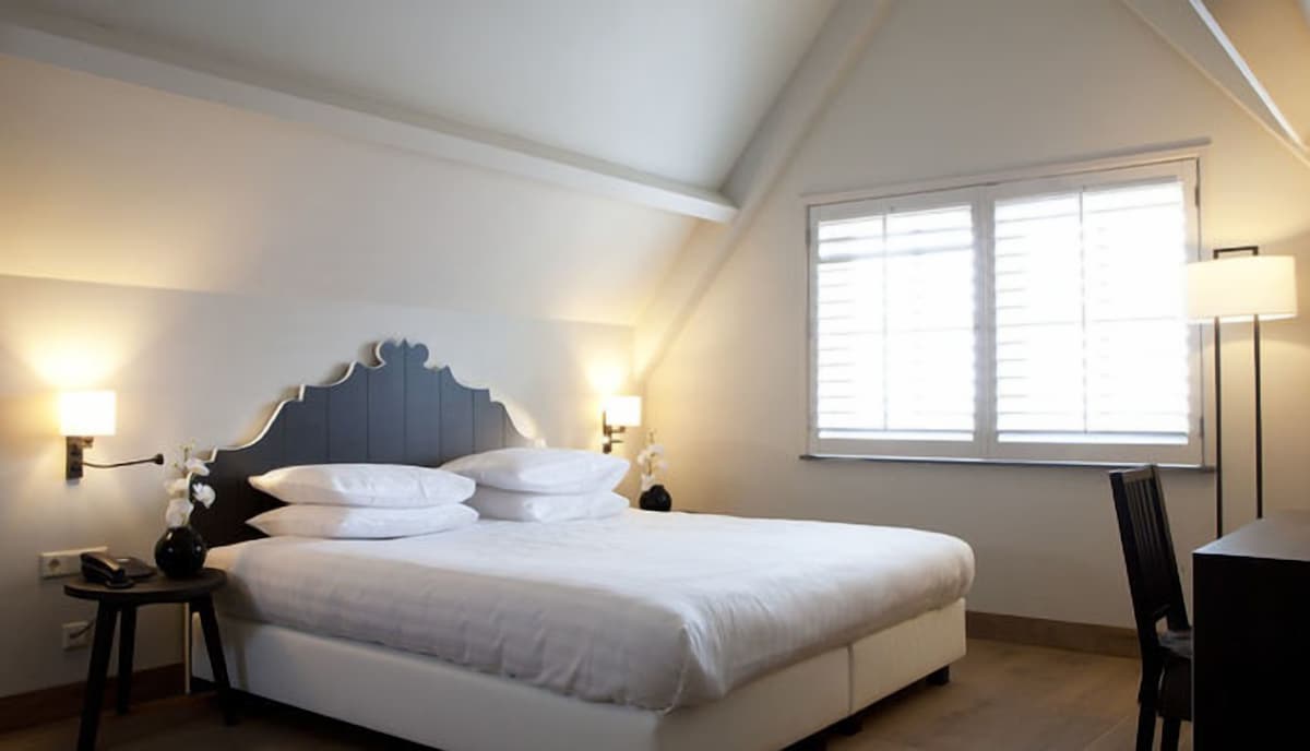 Kamer op eerste verdieping met moderne inrichting. Hartelijk welkom op deze aantrekkelijke plek voor natuurliefhebbers, rustzoekers en romantici. Hotel Het Rechthuis Muiderberg met de details van toen en de luxe van nu. Onze gasten waarderen de ambiance van Hotel Het Rechthuis; de centrale ligging, de landelijke sfeer in het dorp en de gastvrijheid en service van onze medewerkers. Auping boxspring bedden, toilet en douche. koelkast, kluis, waterkoker en smart tv, gratis wifi en gratis parkeren