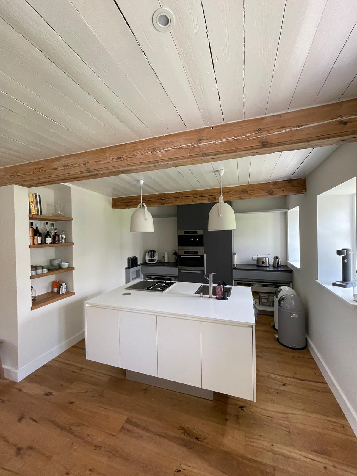 O apartamento de aproximadamente 110 metros quadrados está localizado no térreo da Feringhüs. Do hall de entrada espaçoso, você chega aos quartos e à cozinha com modernos móveis de cozinha e uma área de estar confortável. Na sala de estar adjacente com sofás confortáveis há um verdadeiro "Pesel" frísio. Como na cozinha, as paredes aqui são revestidas com azulejos antigos. Teto de vigas de madeira, pisos de carvalho e janelas com painéis destacam o charme da antiga casa frísia.