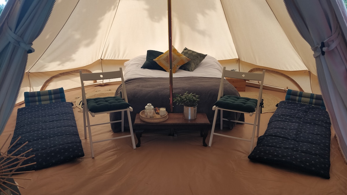 Nossa tenda de sino com cama super-king e roupa de cama luxuosa está perfeitamente localizada em meio a uma paisagem maravilhosa. Há muitas atividades, lugares para ver e eventos localmente. As caminhadas começam diretamente da tenda. O pub local, que serve comida caseira e cervejas locais, fica a 3 minutos a pé. Fornecemos um fogão de indução, geladeira/freezer, churrasqueira, micro-ondas, chaleira e torradeira. Podemos preparar 2 colchões auto-infláveis para crianças, se necessário. A tenda está em sua própria área privada de terra para você usar exclusivamente.