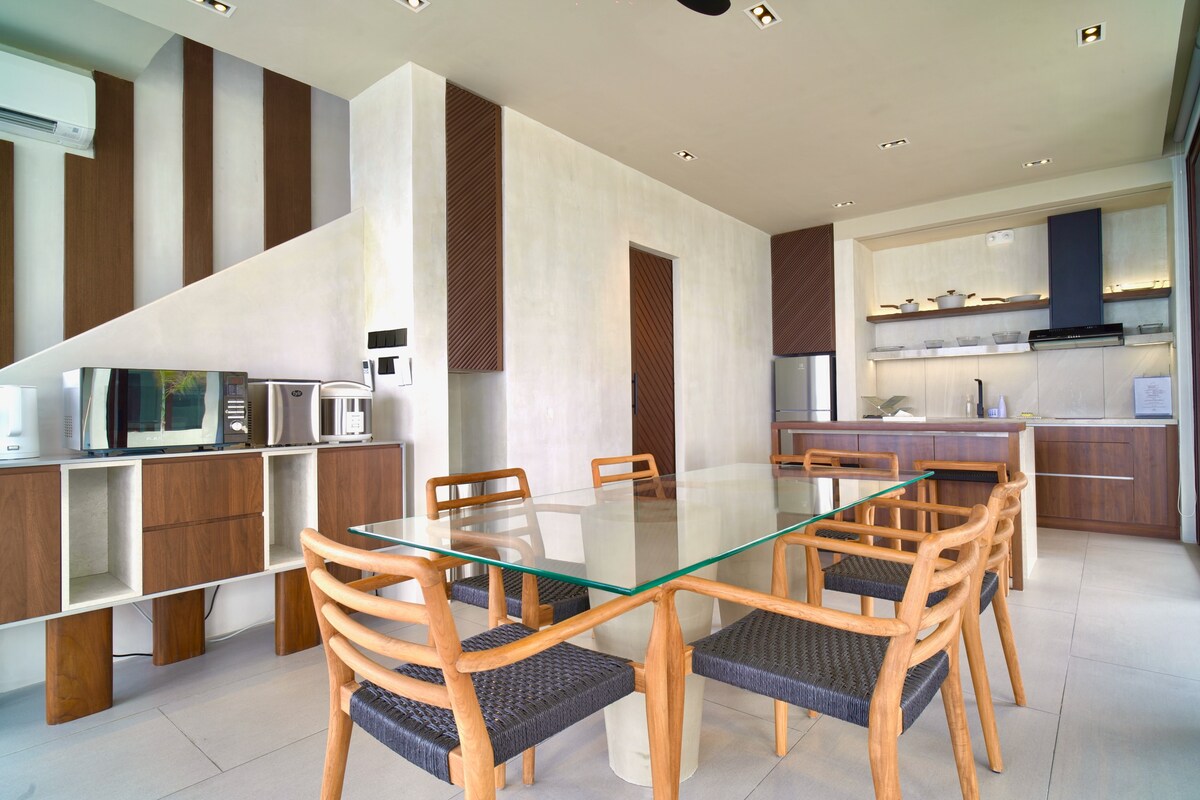 Esta casa de vidro com design industrial e atualizada tem todas as comodidades modernas de que você precisa para aproveitar sua estadia na praia. Uma piscina privada/banheira de hidromassagem disponível para seu uso exclusivo no segundo andar possui uma vista resplandecente para o mar, ao lado de uma área de estar, onde você pode desfrutar de uma taça de vinho ou usar o Wi-Fi de alta velocidade para suas necessidades de trabalho em casa. Uma cozinha totalmente equipada está disponível no mesmo andar para você preparar refeições deliciosas enquanto desfruta da companhia da sua família ao mesmo tempo.