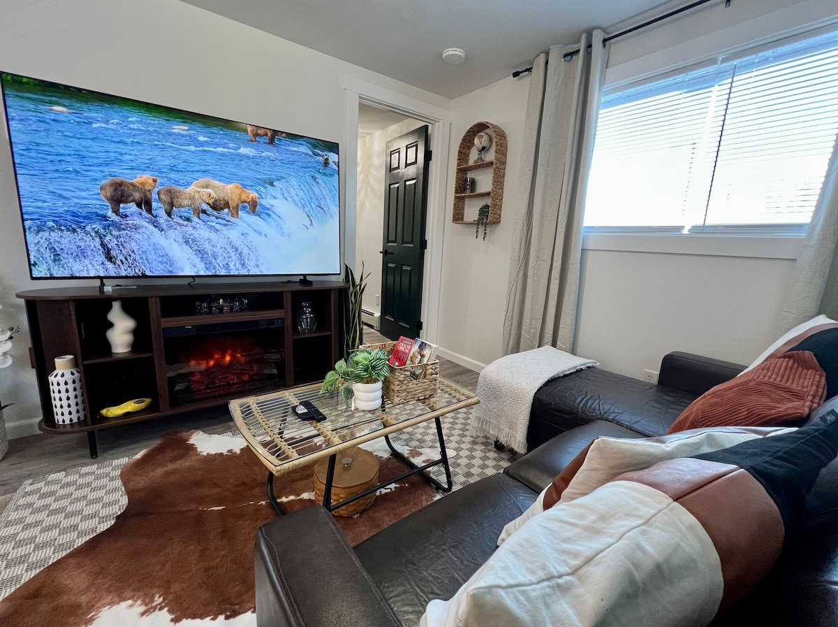 Acabamos de construir este moderno apartamento no Alasca pensando em dar o máximo de conforto e experiência aos nossos hóspedes. Desfrute de uma banheira de hidromassagem relaxante com ducha de azulejos personalizada. Aconchegue-se no sofá de couro reclinável assistindo a um filme na TV HD. Durma confortavelmente na cama king size de espuma de memória. Perto do aeroporto, UAF, restaurantes, trilhas, lojas e atrações turísticas. Máquina de lavar e secar roupa na unidade! Fornecemos alguns itens de café da manhã como aveia instantânea, mistura de panqueca, chá e café.