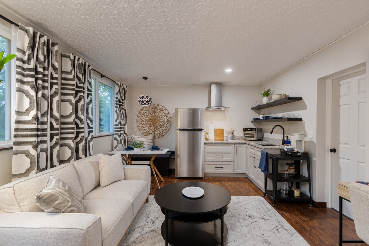 Bem-vindo ao nosso microestúdio relaxante a poucos minutos da histórica vila alemã e do centro de Columbus. Este pequeno espaço cuidadosamente projetado possui uma cama queen murphy, cozinha moderna equipada com uma mini geladeira Smeg, banheiro privativo com chuveiro, smart TV, Wi-Fi e aquecimento/ar condicionado. Saia e aproveite o espaçoso pátio coberto com assentos confortáveis, uma fogueira e TV. Ideal para viajantes individuais ou casais que procuram um refúgio compacto, mas elegante, em um bairro tranquilo e conveniente.
