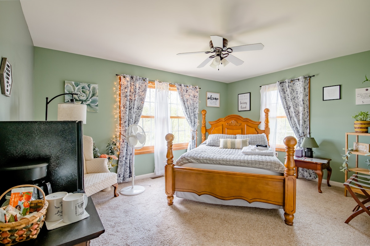 A Suíte de Hóspedes de Nível Inferior de nossa casa é sua para desfrutar de vistas para o vale e natureza em 22 acres de campos e bosques ao lado do Parque Estadual Big Spring. Relaxe, jogue jogos de tabuleiro, pebolim ou basquete arcade dentro ou desfrute da fogueira, campo de golfe de disco, observação de estrelas, caminhada, jogue arremesso de ferradura ou faça um piquenique no pavilhão. Vários parques estaduais estão a menos de uma hora de carro que oferecem pesca, caiaque e natação. Apenas 15 minutos da rodovia na saída de Willow Hill, Rota 75. Cuidado com os buggies Amish!