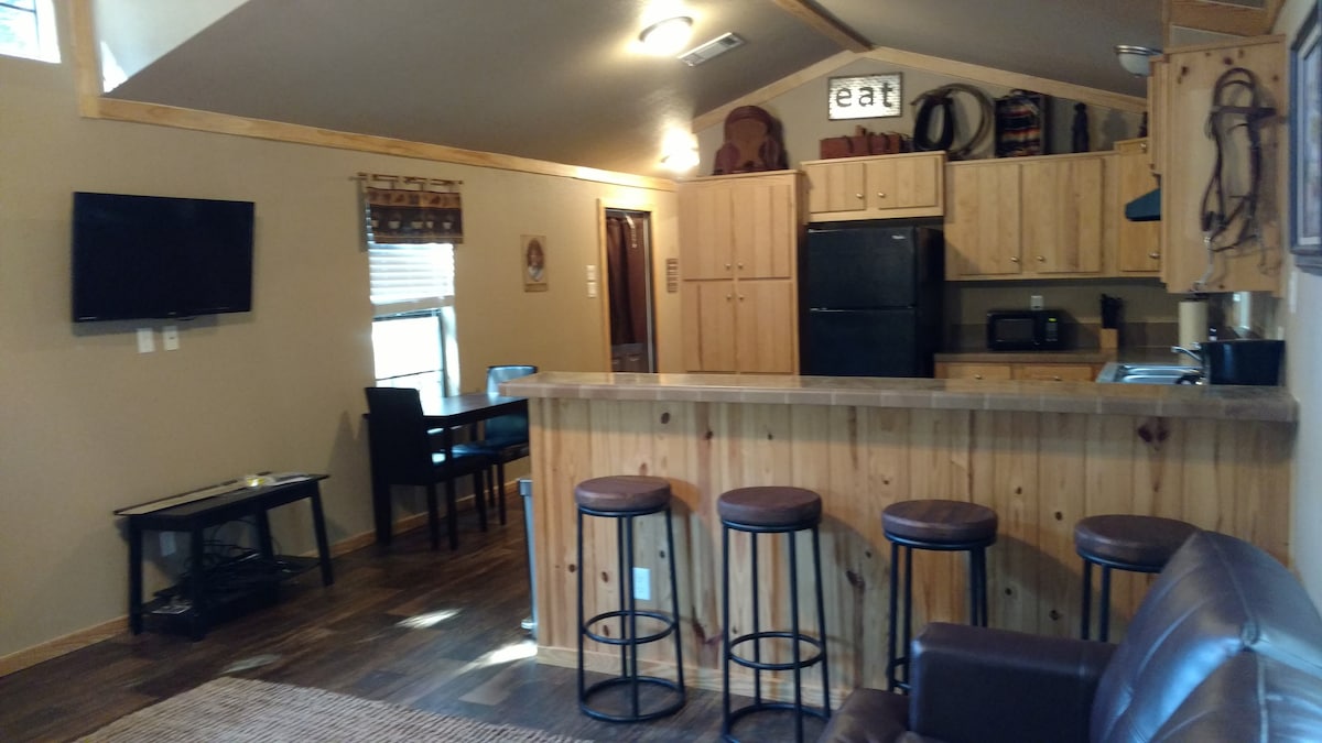 Você vai adorar sua estadia inesquecível nesta microcasa única na pradaria. Esta nova cabana no campo inclui uma cozinha completa, banheiro completo, um quarto queen size no andar principal e três camas - uma queen e duas de solteiro - na área aberta do loft. Este loft romântico tem um teto de 1,20 m no meio com janelas de ambos os lados. Há também um sofá-cama queen size na sala de estar no andar principal. Passe um tempo aproveitando o ar do campo em nossa grande varanda da frente.