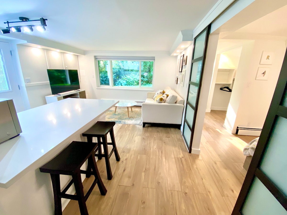 Uma suíte espaçosa com um lindo jardim, que oferece cozinha completa, área de jantar/sala de estar em conceito aberto e um banheiro privativo. Durma bem em uma cama queen size com lençóis brancos limpos e travesseiros divinais. Aproveite o Wi-Fi grátis, assista aos seus filmes favoritos da Netflix em uma TV enorme e desfrute de uma lareira elétrica aconchegante. Café da manhã e garrafas de água são de cortesia! Localizado em um bairro tranquilo com vaga de estacionamento gratuita. 20 minutos de carro de/para o terminal de balsas de Tsawwassen. 30 minutos de carro de/para o aeroporto YVR.