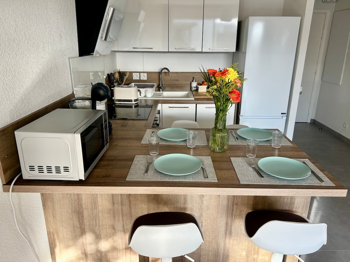 Estúdio de 24 m² climatizado muito bem localizado, a 5 minutos a pé das praias e lojas (padaria e supermercado nas proximidades). Nosso alojamento tem uma vaga de estacionamento privada dentro da residência que é segura. Está bem equipado.(Máquina de lavar roupa, lençóis, toalhas, secador de cabelo, chapinha, cafeteira Nespresso, Wi-Fi, etc.) Você pode acessar a praia e o mercado noturno por um pequeno caminho para pedestres. Aproveite as férias e o prazer de tomar sol em nossa bela região