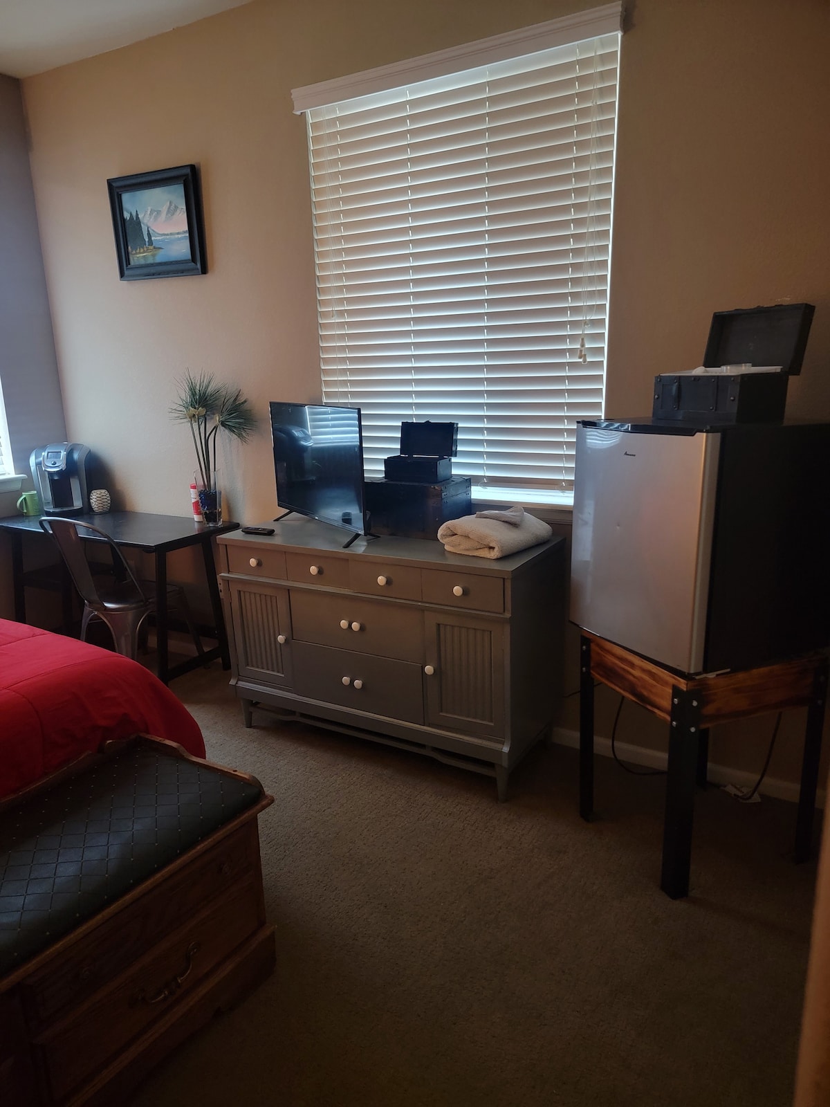 Estúdio de hóspedes totalmente reformado em uma propriedade de 1/2 acre. Esta unidade tem sua própria área privativa ao ar livre equipada com uma churrasqueira a gás e uma mesa de jantar ao ar livre. Tem um banheiro completo com um painel de chuveiro moderno e sistema moderno de aquecimento/refrigeração silencioso. A cozinha é pequena, então não há forno; em vez disso, há um combo de micro-ondas/fritadeira a ar/forno. Um cooktop de dois queimadores e uma combinação de torradeira/cafeteira. O Futon se transforma em uma confortável cama queen size. Muitas vagas de estacionamento disponíveis na propriedade também.