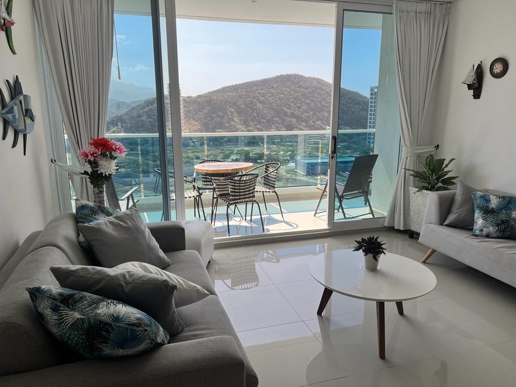 DISFRUTA TUS VACACIONES. A 10 min del aeropuerto y 10 min del centro de Santa Marta, un clima maravilloso donde se conjugan los vientos de la Sierra y del Mar Caribe. Acceso directo a la playa, piscinas, GYM, zona húmeda, co-working, salones de lectura, de Televisión, wife, guardería, restaurantes. Apto con cocina dotada, lavadora, secadora, dos habitaciones, terraza amplia, televisión, aire acondicionado y 3 amplios baños. Una Cama Queen, una doble, 2 sencillas, Twin bed y Sofá cama doble