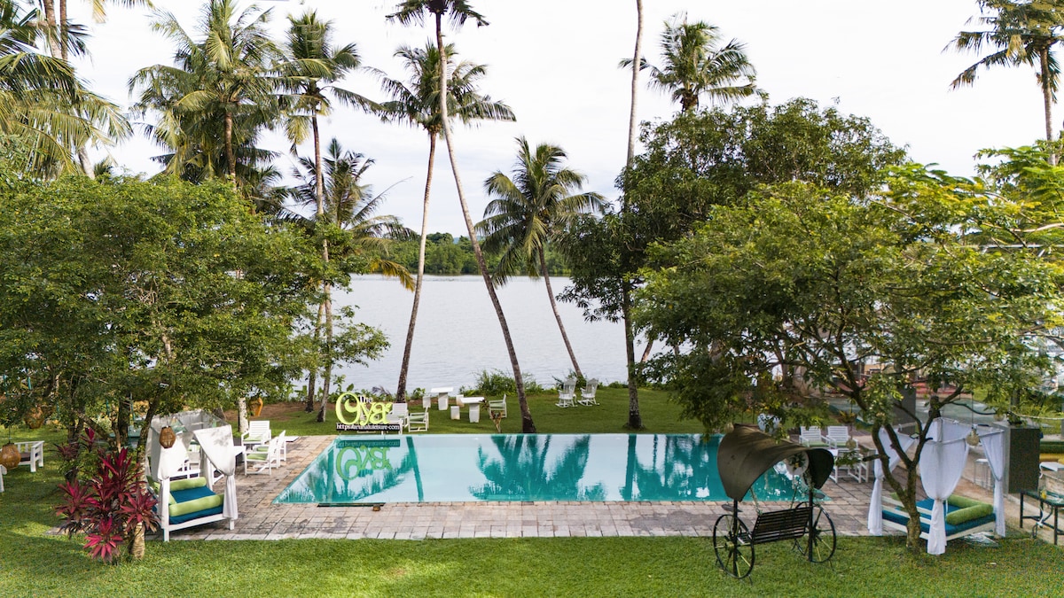 Este quarto de 17 m² está localizado diretamente na lagoa Goviapana. Grandes portas de vidro deslizantes deixam entrar muita luz enquanto uma porta de mosquiteiro garante que os hóspedes indesejados fiquem do lado de fora. O chuveiro ao ar livre com vista para os coqueiros é o nosso pequeno destaque. A piscina e a shala convidam você para se exercitar e se refrescar.