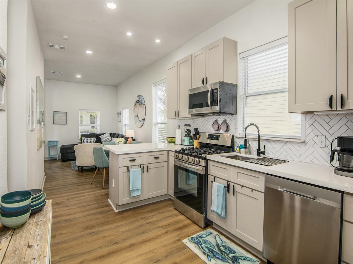 Perfeitamente situada entre o centro da cidade e a praia, esta casa recém-concluída e cheia de luz é o local perfeito para aqueles que querem explorar tudo o que Galveston tem a oferecer. Com designs elegantes que enfatizam a funcionalidade, a casa acomoda cinco pessoas, dispõe de cozinha completa, sala de jantar, área de leitura no 2º andar, área de entretenimento ao ar livre e máquina de lavar e secar roupa de tamanho completo. Quando você não estiver apreciando a decoração contemporânea ou o espaço de estar ao ar livre, você pode explorar a encantadora cidade histórica nas proximidades.