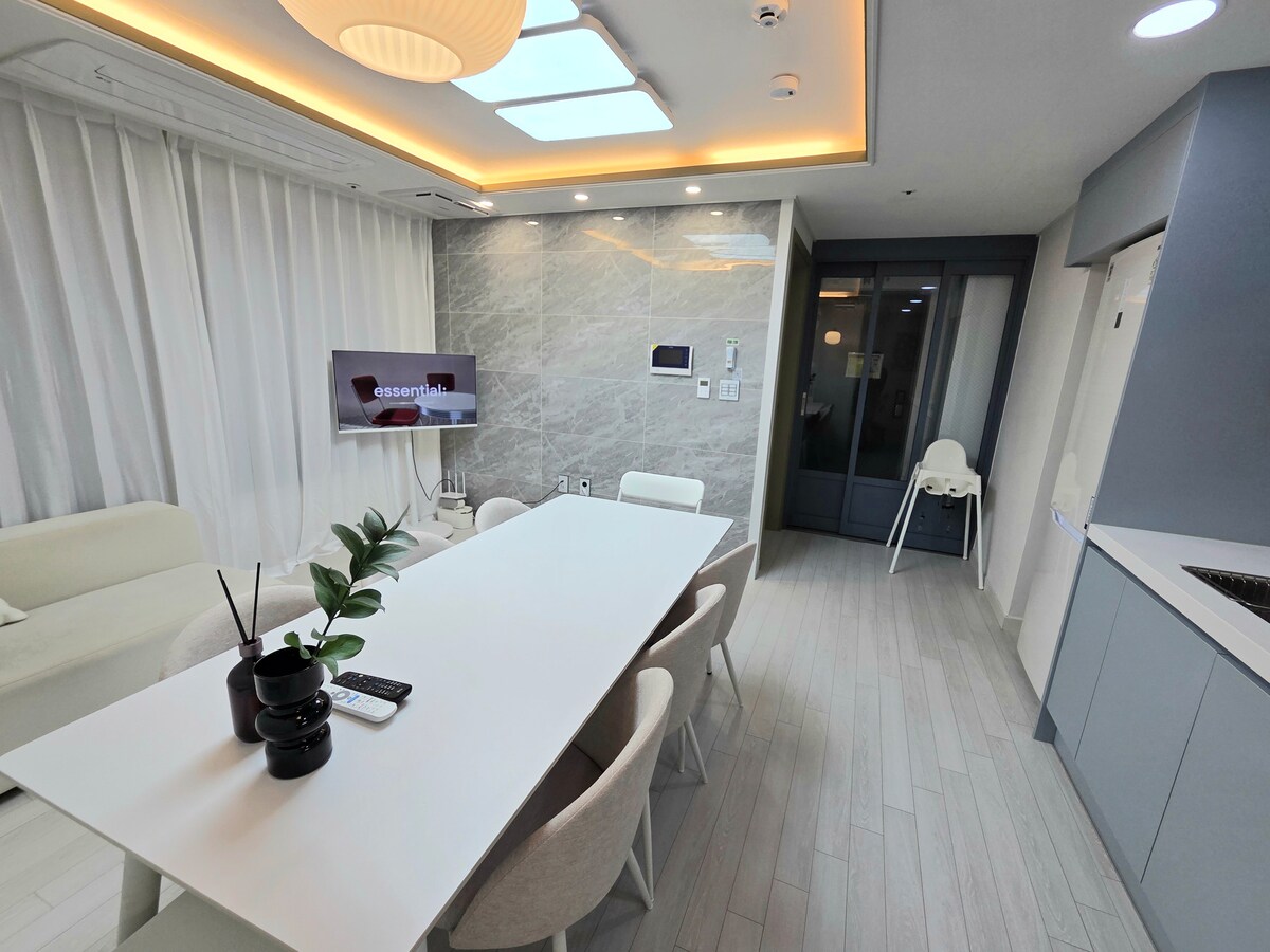 Soo Cozy Stay 🍃 A cosy and modern space built by a photographer, right next to Gimpo Airport ✈️ Ideal for business, travel, and relaxation 🌿 Location: Gonghang-dong, Gangseo-gu, Seoul (5-min walk from Songjeong Station) Property Type: 3 rooms + cosy living room / new building / elevator included Max Occupancy: 6 guests (1 Queen + 3 Super Singles) Parking: 1 car inside the building (extra cars at nearby paid parking lots) 🔒 Amenities: 24/7 security CCTV / high-speed Wi-Fi / Netflix & YouTube