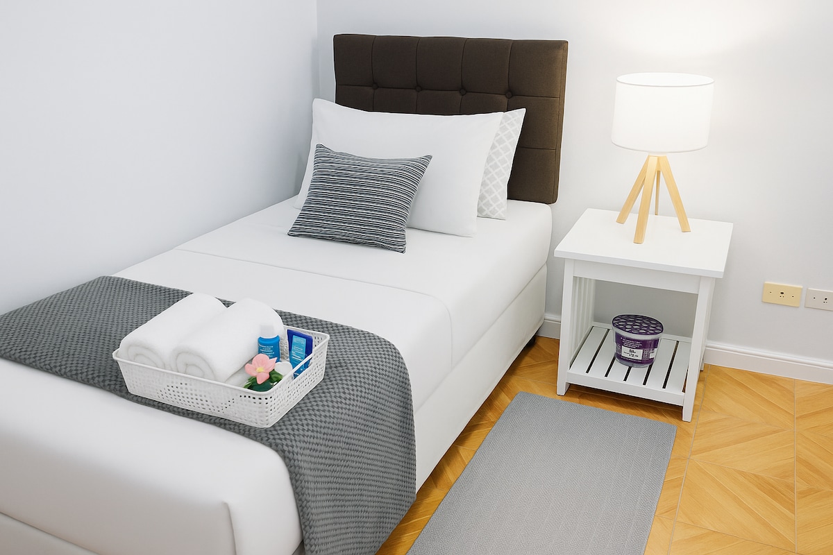 🗝️Key- secured gate and smart lock door access ☕️ coffee area, wine bar 🛋️ cozy living area 👩🍳Fully equipped kitchen and dining space 🛌- Air-conditioned bedroom with 📚study den Bathroom with bathtub and shower 🚽 Separate restroom Free WiFi Entertainment with 55” Smart TV with NETFLIX With board games and Bluetooth Party Karaoke Free toiletries
