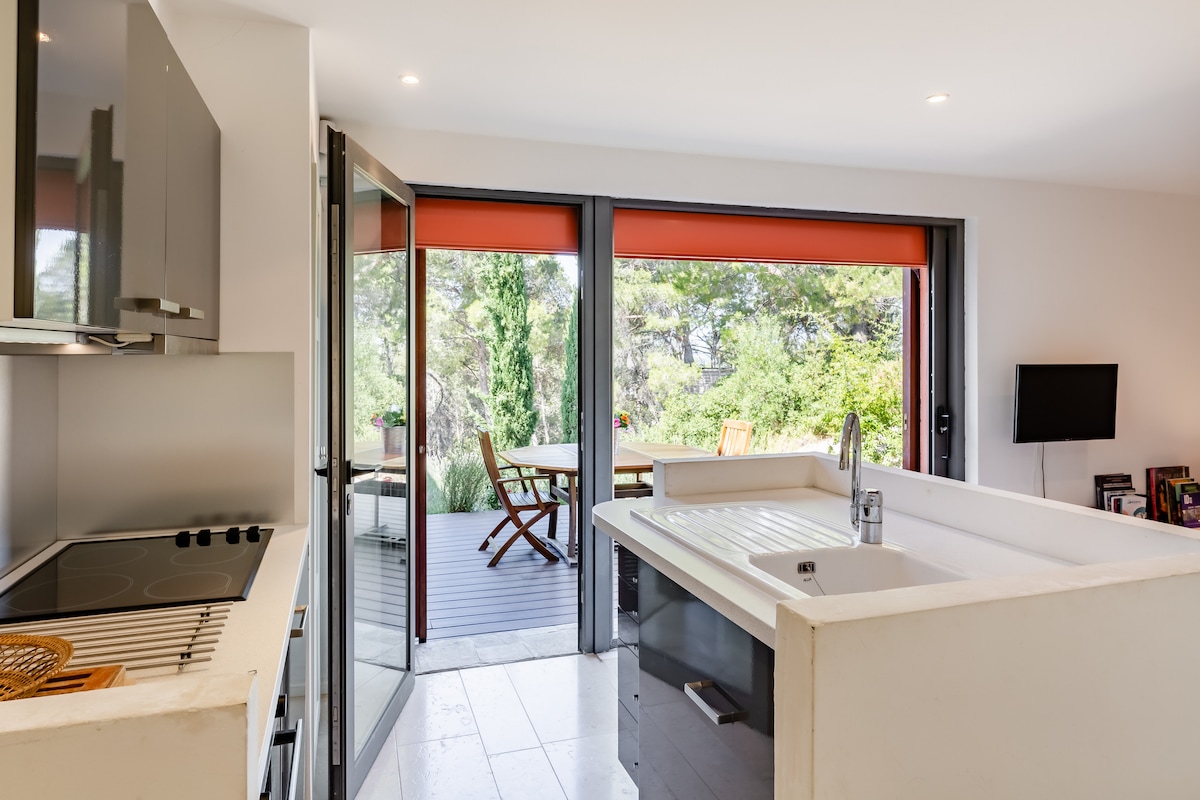 Fuja para a deslumbrante Costa Azul e experimente a Provença em um estúdio cuidadosamente projetado por proprietários arquitetos. Acorde com vistas deslumbrantes para a colina e para o mar a partir do seu terraço privativo e desfrute de todos os confortos modernos. Caminhe até a praia de areia e explore as enseadas com um caiaque marinho gratuito. Convenientemente localizado a 10 minutos da estação de trem local e a 25 minutos do aeroporto de Marselha com estacionamento gratuito. Uma aventura inesquecível espera por você na Costa Azul da Provença!