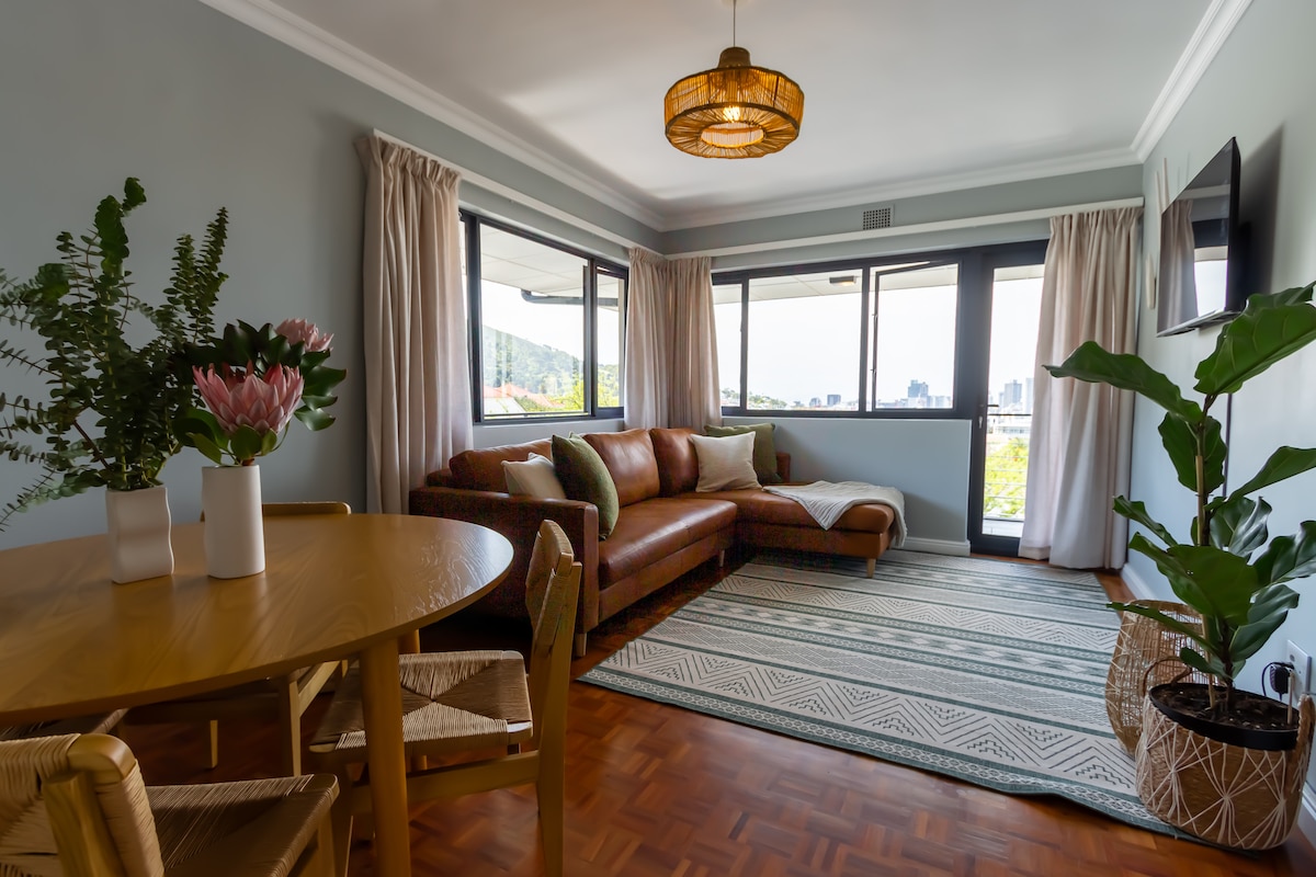 O apartamento recém-renovado e elegantemente mobiliado está localizado no sopé da Table Mountain, em uma área segura, com restaurantes e bares ao virar da esquina. É aqui que você mora. O espaçoso e extremamente luminoso apartamento tem uma cozinha moderna, uma sala de jantar com uma grande mesa de jantar e uma acolhedora sala de estar com um sofá extremamente confortável. Mas o apartamento é apenas secundário - tudo aqui gira em torno da vista fantástica da Table Mountain, Lions Head e do porto.