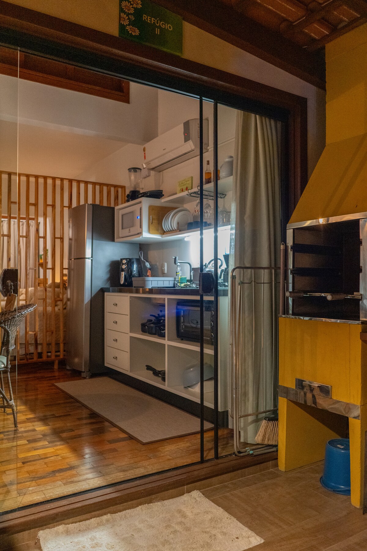 A Kit 2 acomoda 2 pessoas. E dispõe de cama de casal, ventilador de teto, Ar Condicionado (quente/frio), TV SMART, roupas de cama e banho. Cozinha completa com todos os utensílios, fogão, geladeira, liquidificador e cafeteira. Um banheiro com ducha elétrica secador de cabelo e itens básicos. Vaga de estacionamento para um carro. Wi-Fi. Varanda com vista para o patio e morro da Guarda. Ducha externa, tanque, patio/jardim compartilhados com outros hóspedes!