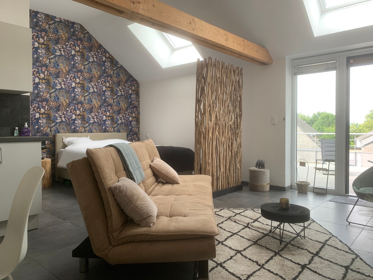 Estúdio soberbo, moderno, luminoso e aconchegante no 1º andar de um celeiro completamente renovado. Tranquilo, no coração de Centre Ardenne, a 100 metros de lojas de alimentos, a 200 metros de um shopping center. Ideal para um casal. Cozinha equipada, banheiro separado com chuveiro italiano e vaso sanitário. Grande terraço de 25 m² com mesa para 2 pessoas e móveis de jardim (no verão). Máquina de lavar roupa compartilhada com os outros estúdios. Uma cama de casal 160 + um sofá-cama (1 adulto ou 2 crianças) no mesmo quarto.