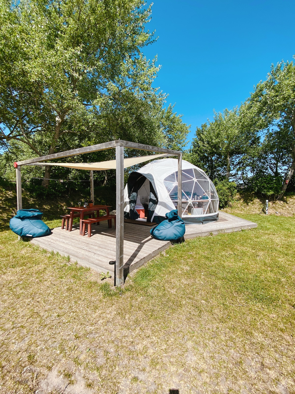 Esta excelente tenda de glamping com piscina comunitária (compartilhada) e área de churrasco privada pode ser sua. Você passará suas noites na cúpula de acampamento de 20m2/215 pés quadrados, que não só está equipada com uma lareira interna, mas também tem uma ventilação de ar para que você possa dormir perfeitamente na cama king size. Na temporada de inverno, adicionamos um cobertor de aquecimento elétrico à cama