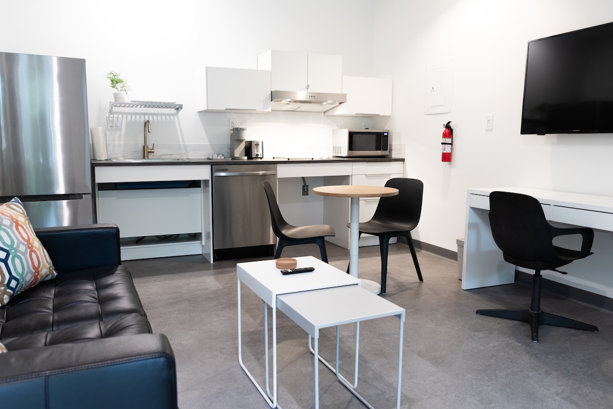 Um apartamento isolado, mobiliado de um quarto, totalmente acessível e tipo hotel. Um self check-in perfeito oferece acesso a um espaço de estar ideal. Uma casa longe de casa completa com uma cozinha conveniente; fornecemos todos os itens essenciais nos armários. Wi-Fi 5g protegido por firewall rápido com um espaço para trabalhar e muito mais para relaxar. Aproveite um chuveiro quente instantâneo e uma cerveja Keurig rápida, e proteja sua suíte com um toque de botão antes de ir para a cidade. Esperamos que você aproveite nossas comodidades incomparáveis.