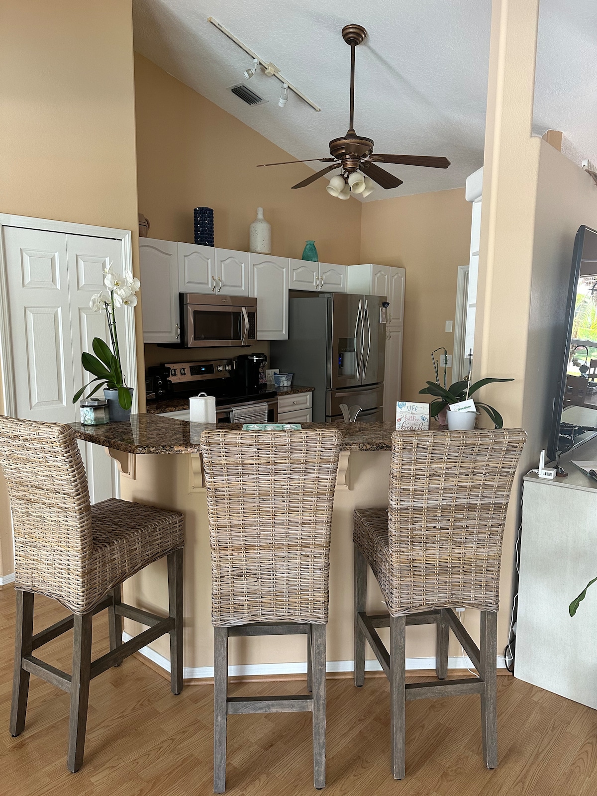 Casa de férias privada atualizada em pequena comunidade muito tranquila em estrada sem saída: - Suíte master privativa: cama king/banheiro privativo recém-reformado (veja as fotos!): Acesso privativo à piscina - Piscina aquecida durante todo o ano -3 camas king cada uma com TVs de 55 polegadas/1 beliche - Paisagismo luxuoso em torno da casa e piscina para férias privadas - Perto da praia, compras, campos de beisebol, cinema, restaurantes e Central Vero Beach. - Grande área de estar: TV de 75 polegadas: TV ao vivo mais streaming: Internet de 1000mbps