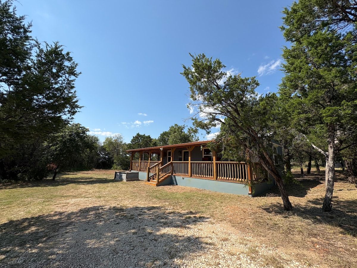 Esta pequena casa de campo encantadora é de construção nova, projetada no estilo “fazenda industrial chique”. É o lugar perfeito para uma escapada romântica ou uma aventura relaxante no campo. Aprecie as vistas arborizadas da varanda dos fundos, caminhe até o lago ou desfrute de um dia no centro de Granbury! Se você tiver sorte, poderá até ver o corredor de estrada do bairro. Ele adora usar nossa varanda dos fundos como um esconderijo!Queremos ter você, então venha ficar um pouco.