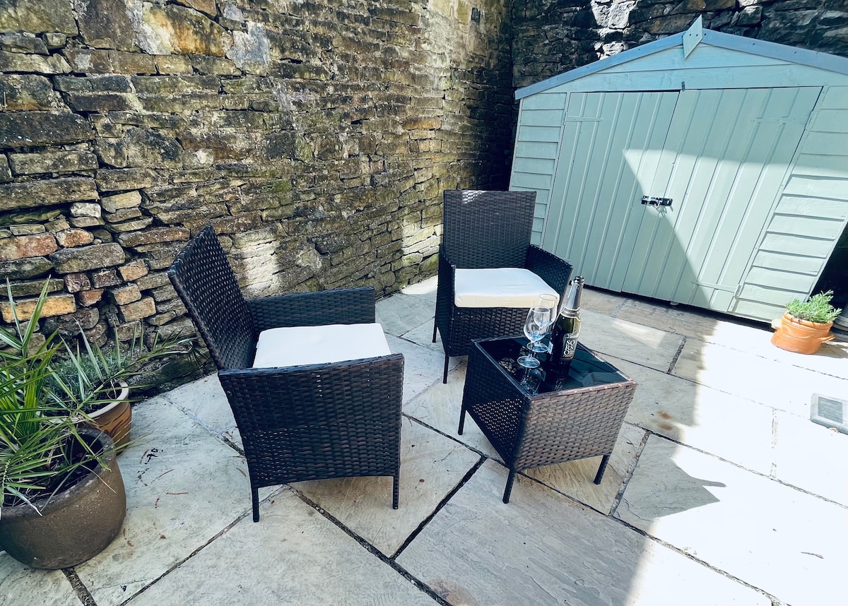 Blue/white decor. Includes tea/coffee/milk/sugar. Crockery, cutlery, towels, microwave, electric pan hob, electric mini oven and grill, fridge/freezer, toaster, kettle, cleaners & towels. Iron/ironing table, cloths rack/hair dryer, Aircon, TV with DVD.WiFi. D/bed, table+2-chairs. Sofa bed. Patio garden & planted. Outdoor table, chairs and umbrella. Its on the edge of Peak National Park with walks, cycle tracks and access to local rail station. Pub food nearby and take-aways nearby.