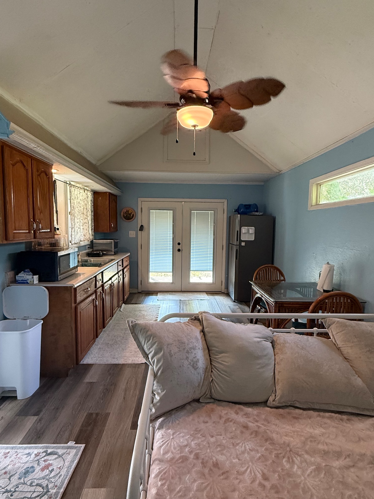 Pet friendly cottage! Located just miles from shopping and all eateries in town, only 15 minutes from the SSI Causeway. One large bedroom, accompanied by a queen bed and large SmartTV. Living space hosts full daybed. Kitchen with ample storage features a fridge/freezer combo, coffee maker, microwave with air fryer and convection oven options and other cooking appliances. All essential cookware is provided - pans, pots, silverware, cups, bowls, plates, etc.