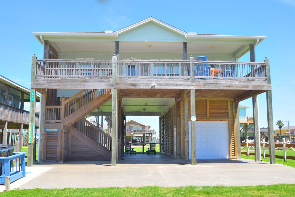 Vista desobstruída para o mar! Veja toda a praia até Galveston. Quatro quartos e 3 banheiros e meio. Muito espaço e vários decks para aproveitar o sol. Você tem espaço para se divertir, dentro da casa de praia, mas também embaixo, onde você encontrará um grande bar embutido, churrasqueira a propano/carvão, balanços, loft de rede e chuveiro ao ar livre. Cercado no quintal. Passagem privativa para a praia. Cozinha gourmet com despensa de mordomos. TVs em todos os cômodos. O mestre tem banheira de imersão com vista para a praia! Acomoda 14 pessoas