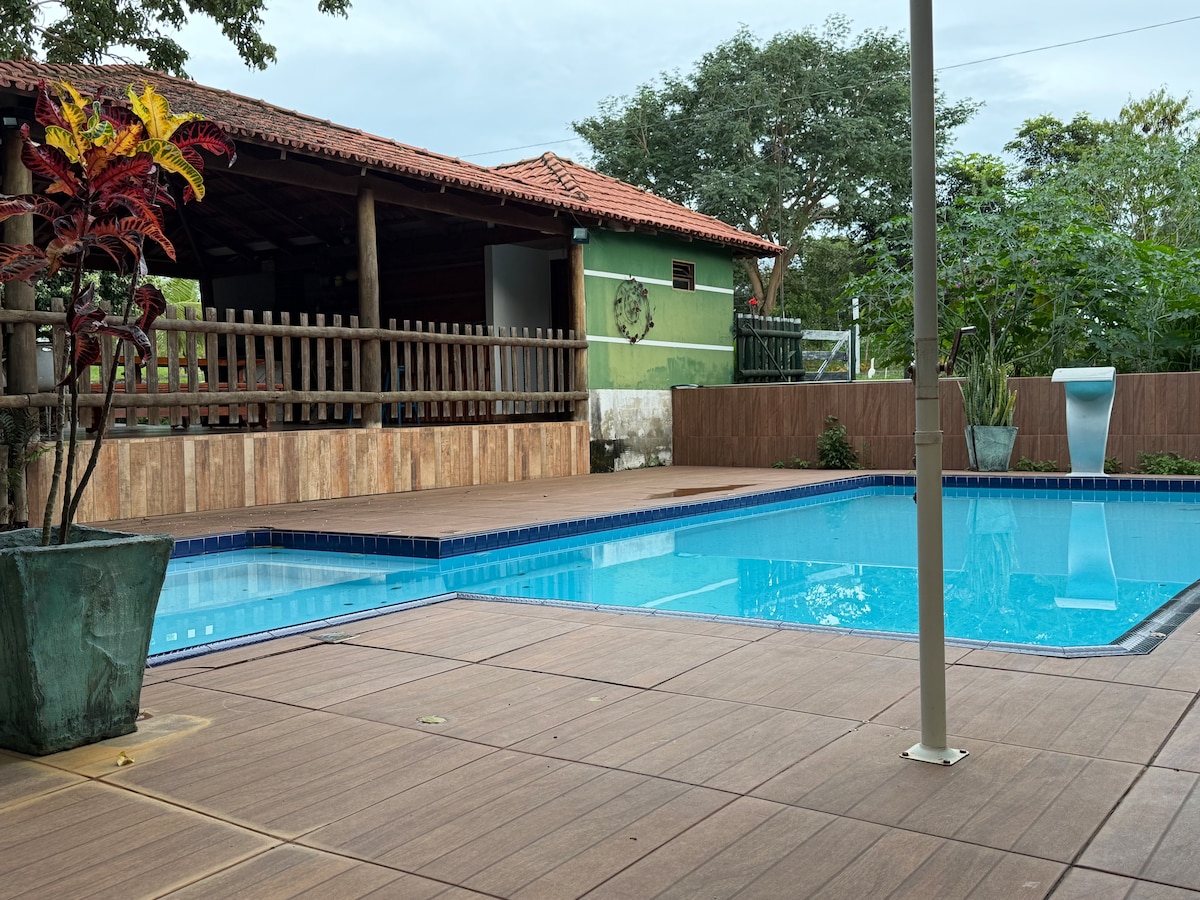Leve toda a família a este ótimo lugar com muito espaço para se divertir. Local super seguro. Casa super espaçosa, área de lazer completa, piscina enorme com trampolim,e piscina rasa para as crianças,campo de futebol golzinho, sinuca, casa estilo chácara, local muito aconchegante arborizado, muito verde.... Quem se hospedar com certeza vai adorar!!!!! Casa muito bem localizada na entrada da cidade,bairro nobre, 1 esquina de 2 supermercados grandes, açougue, distribuidora, tudo pertinho.