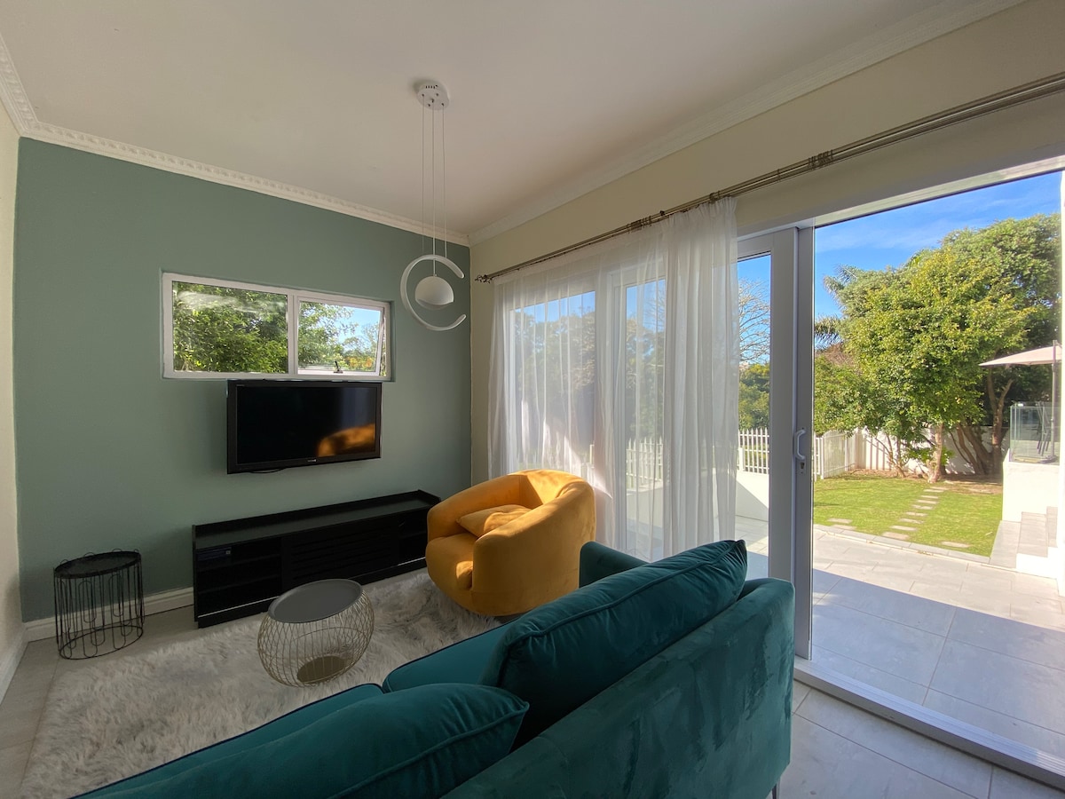 Entre em nosso apartamento de autoatendimento lindamente projetado, onde móveis modernos encontram um interior exuberante e verde para uma experiência verdadeiramente tranquila. Perfeito para famílias, incluindo seus amigos peludos, nosso espaço oferece um retiro tranquilo para todos. Aproveite a área externa com instalações de braai, um banco de piquenique e luzes de cordas encantadoras para criar uma atmosfera aconchegante. Convenientemente localizado perto do aeroporto, centros de entretenimento e praias principais, você terá tudo o que precisa para uma estadia memorável.
