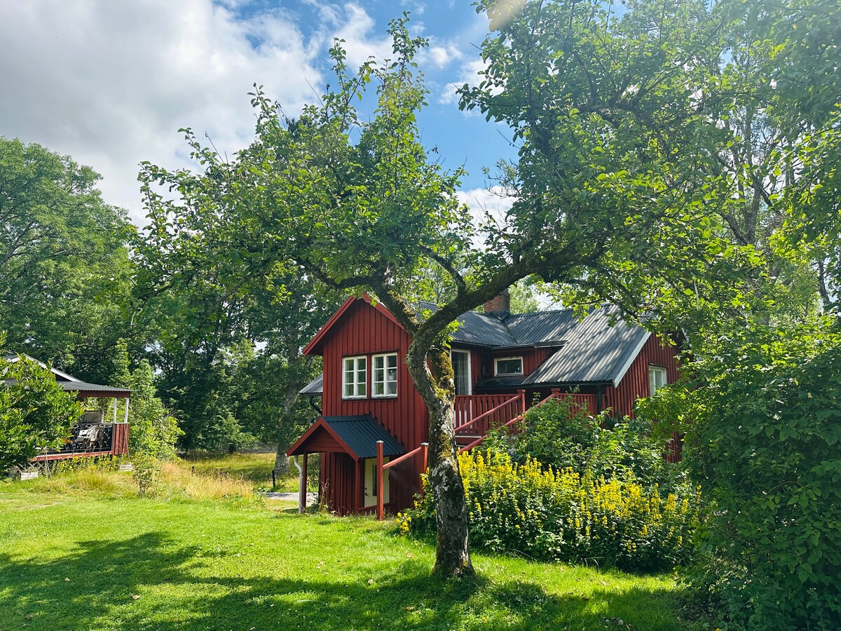 Idyllisk röd stuga med öppen spis och trädgård