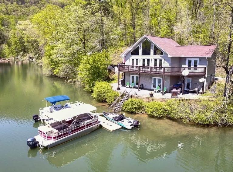 Escape to a waterfront home experience. Nestled on the shores of Lake Santeetlah, this lakefront retreat promises relaxation and breathtaking views. Enjoy multiple decks overlooking the calm waters, along with access to a canoe and paddleboard for recreation. Life vests are provided for safety. Fish from the private deep-water dock, swim, or float the day away. Boat rentals are conveniently located just 300 yards away, with downtown Robbinsville a mere five-minute drive.