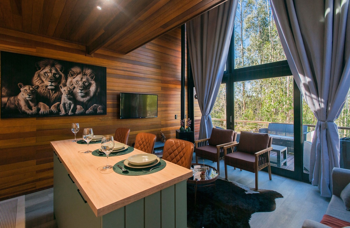 Venha viver uma experiência única e inesquecível em Gramado. Cabana estilo A-frame, imersa na natureza. Um refúgio com estilo próprio. Árvores nativas, pinheiros e araucárias criam diversas camadas de verde em diferentes tonalidades. Dentro dela, você encontra a combinação do rústico com o aconchegante, texturas diferentes em cada detalhe, do couro à madeira, do ferro ao vidro, o que faz o design ir além do visual e transmitir sensações.