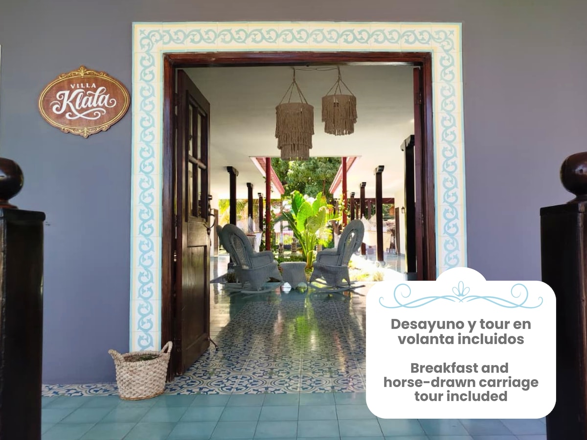 Joya colonial en el corazón de Granada, a minutos de famosos escenarios llenos de arquitectura colorida y ambiente vibrante. Klala tiene estilo tropical y detalles únicos. Disfruta de un delicioso desayuno y tour en volanta incluidos, una experiencia auténtica por sus pintorescas calles. Capacidad para un máxima de 18 huéspedes. La app permite registrar hasta 16 huéspedes; las 2 personas adicionales tiene un costo de $80 por día, el cual se cobrará mediante una solicitud de pago desde la app.