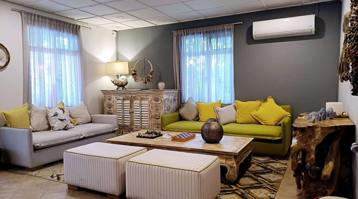 Aproveite o melhor da vida na ilha nesta vila tranquila de 3 quartos, perfeita para famílias ou amigos. A propriedade inclui dois apartamentos separados em uma vila — uma unidade de 2 quartos no térreo e uma unidade de 1 quarto logo acima, cada uma com sua própria entrada, cozinha e banheiro. Relaxe no exuberante jardim tropical ou refresque-se na piscina cristalina, à qual você terá acesso exclusivo durante sua estadia.